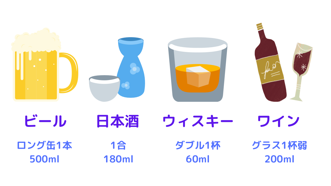 これは大体、ビールならロング缶一本分(500ml)、日本酒なら一合(180ml)、ウイスキーならダブル一杯(60ml)、ワインならグラス一杯弱(200ml)に相当します。