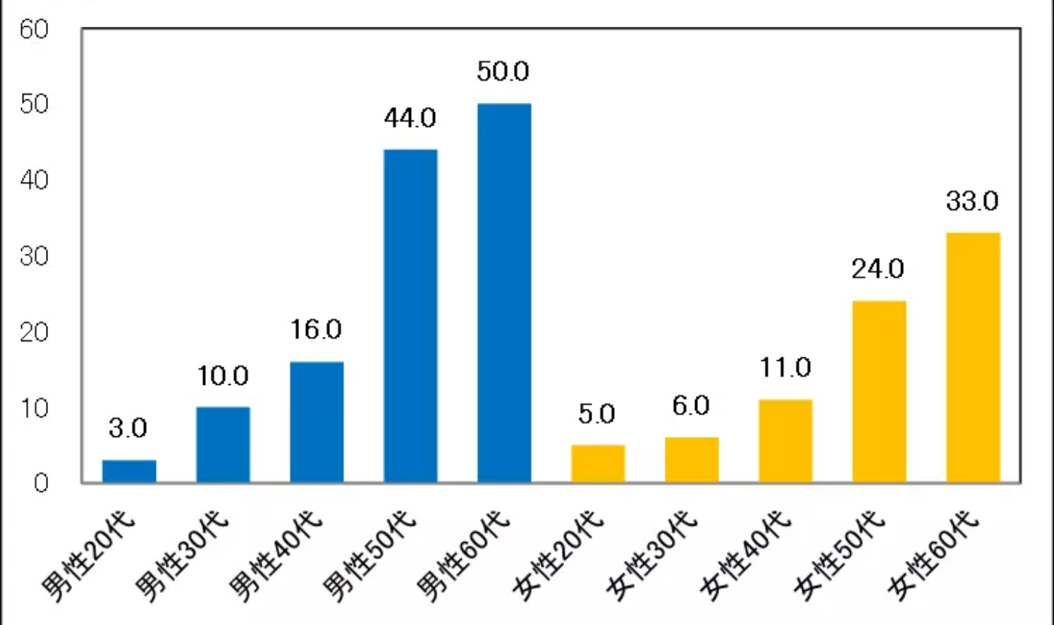 この表からも明らかなように、男女ともに(特に男性が顕著ですが)、50代からの割合が急激に増加しており、